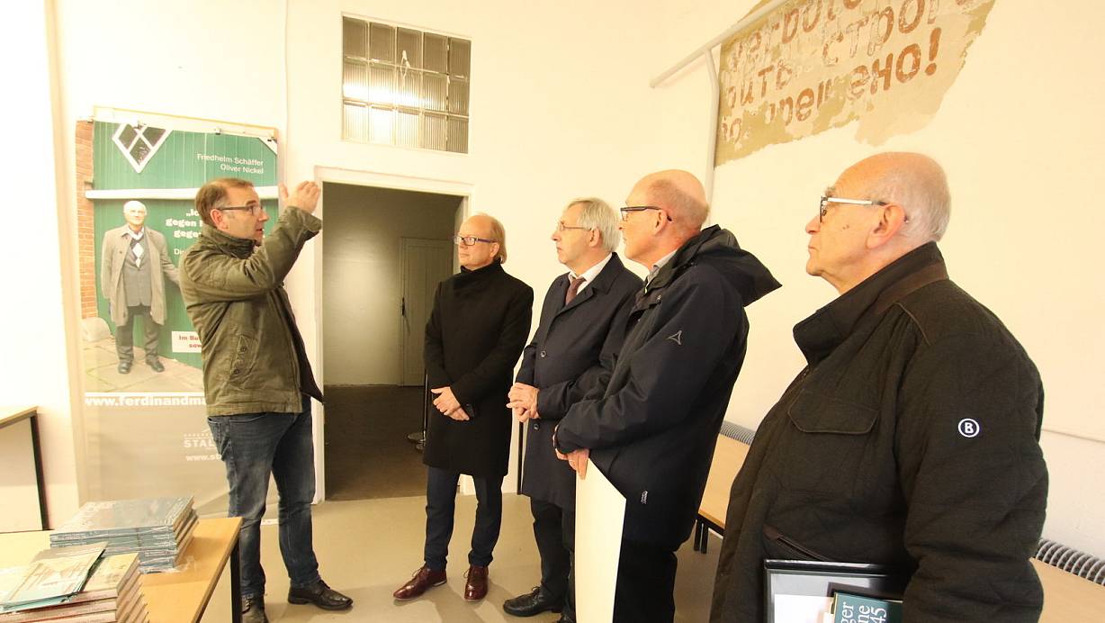 Facetten: Oliver Nickel, Geschäftsführer der Gedenkstätte Stalag 326 (l.) erklärt Landtagspräsident André Kuper (2. v. l.) und Staatssekretär Klaus Kaiser (3. v. l.) im Beisein von Burkhard Poste und Jürgen Spieß (r.) vom Förderverein die Besonderheiten der ehemaligen Entlausung des Kriegsgefangenenlagers. Zum Beispiel das freigelegte Textfragment "Rauchen verboten". | © Sabine Kubendorff