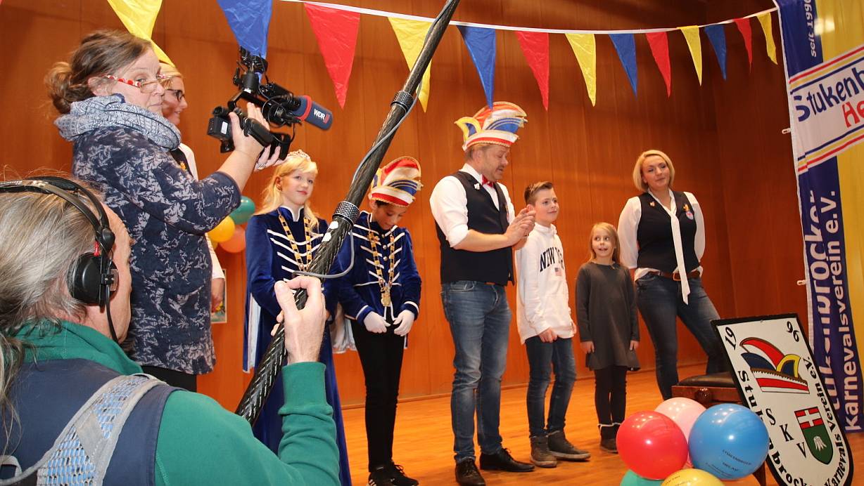 Die Proklamation des neuen Prinzenpaares findet erstmals vor großem Publikum in der Aula der Grundschule statt. Ein Fernsehteam filmt