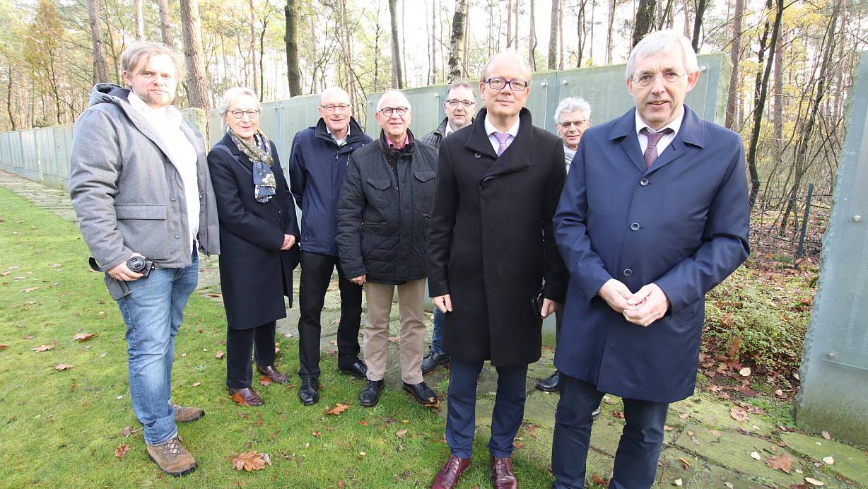 Gruppenbild mit Geldgebern: Historiker Jens Hecker (v. l.), Elisabeth Bultmann, Burkhard Poste, Jürgen Spieß und Oliver Nickel von der Gedenkstätte Stalag 326 mit Landtagspräsident André Kuper, Hans Wupper-Tewes von der Landeszentrale für politische Bildung und Klaus Kaiser, Staatssekretär des Kultusministeriums, vor den Gedenkstelen auf dem Sowjetischen Ehrenfriedhof. | © Sabine Kubendorff