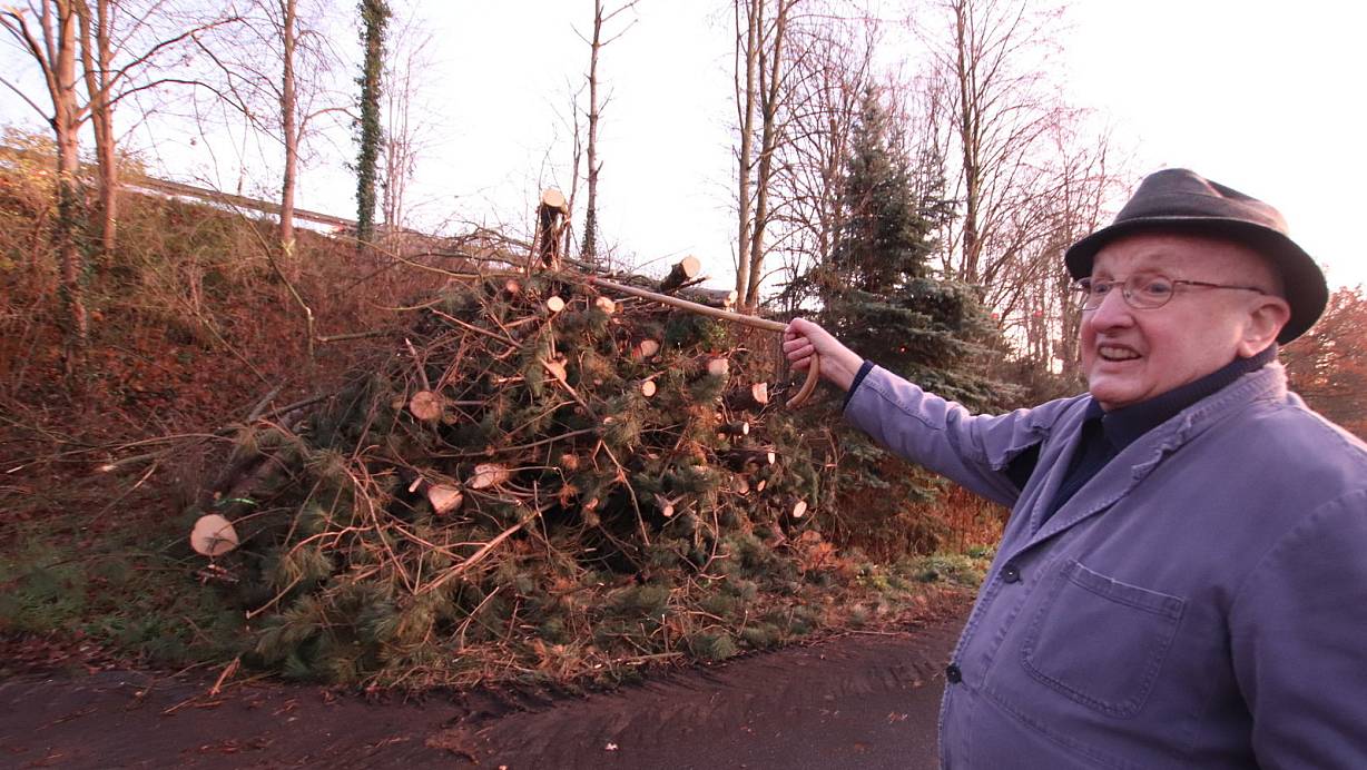 Dort türmen sich die Holzhaufen. Anwohner Josef Justus hält den starken Rückschnitt für überzogen. Einerseits seien gar nicht alle Bäume krank, andererseits blickten die Anwohner jetzt durch die Lücken direkt auf die viel befahrene Oerlinghauser Straße. | © Sigurd Gringel
