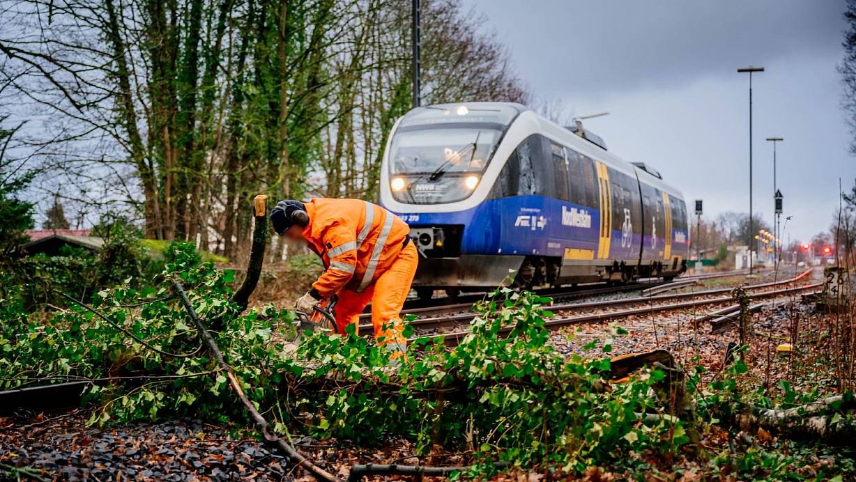 Die Sennebahn rollt zur Probe über die Strecke zwischen Bielefeld und Paderborn. Kurz hinter dem Bahnhof Schloß Holte zersägt ein Bahn-Mitarbeiter einen kleineren Baum, der auf die Gleise gefallen war. | © Besim Mazhiqi