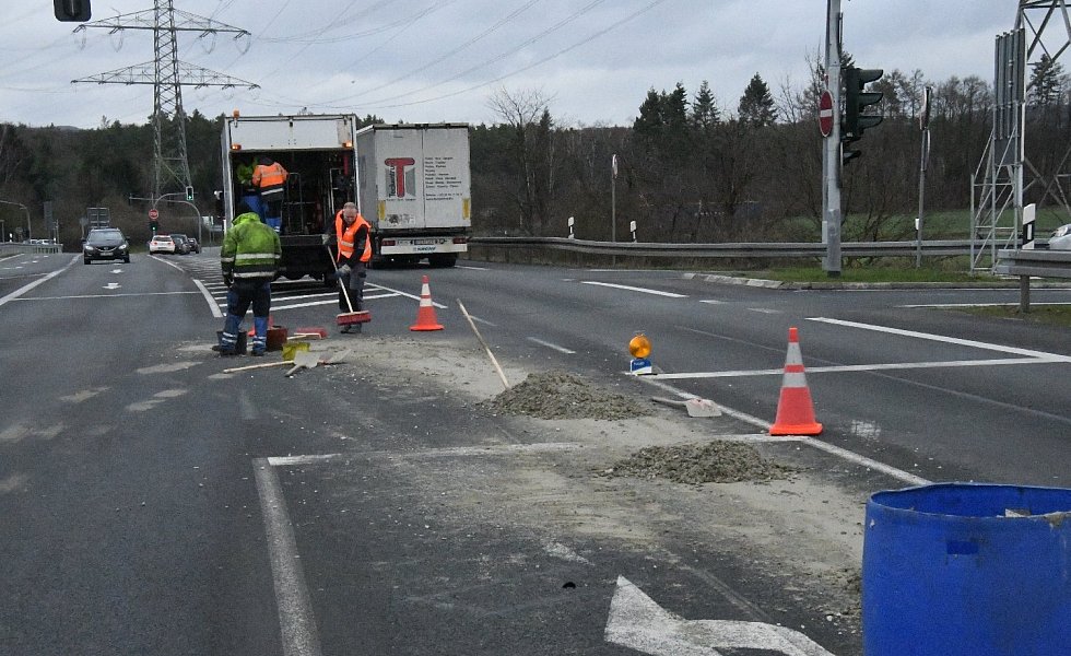 Der 41-jährige Fahrer eines Betonmischers aus Bad Salzuflen wollte von der Oerlinghauser Straße links auf die Autobahn 33 in Richtung Bielefeld fahren, als er bemerkte, dass er seine Ladung verliert. Vermutlich, so ein Polizeibeamter vor Ort, hatte sich durch einen technischen Defekt ein Verschluss gelöst.