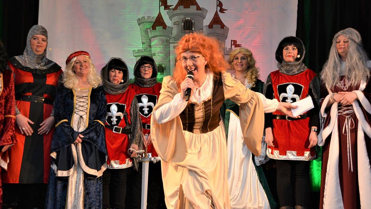 Ja so warn’s, die Rittersleut. Auf der Bühne kommen sie vor der von Jennifer Walz gemalten Burg zusammen. Ute Schniedermann, mit roter Lockenpracht kaum wiederzuerkennen, stimmt das Publikum ein. | © Karin Prignitz