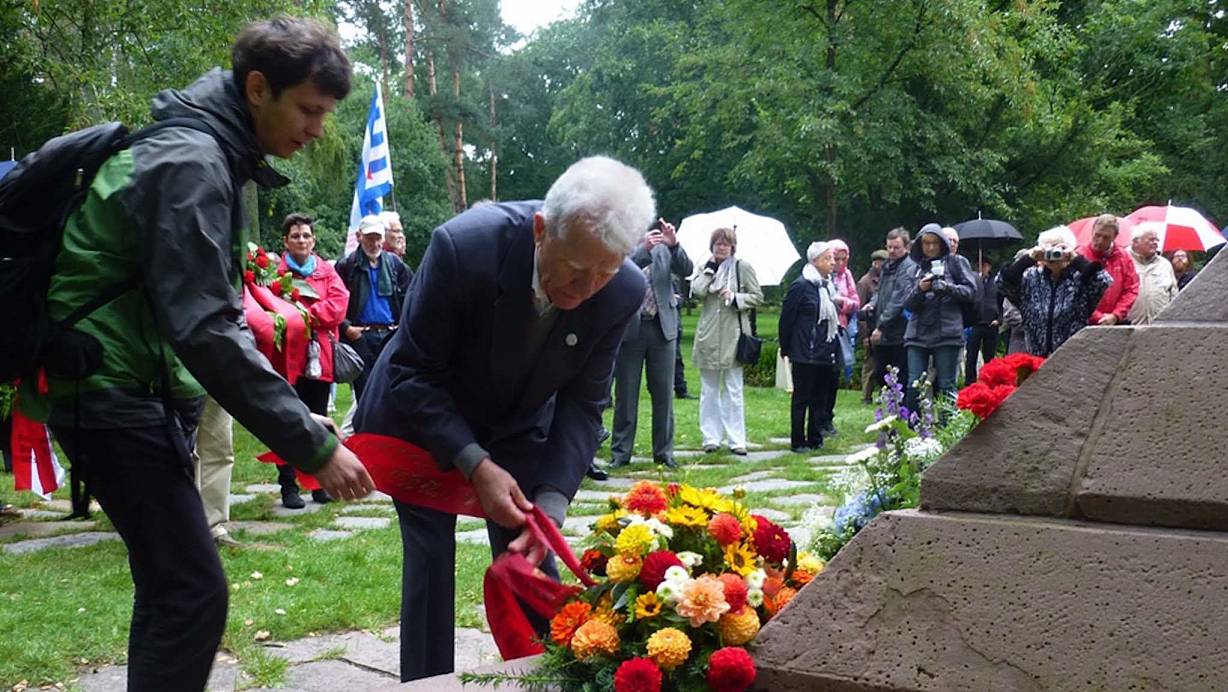 Im September 2015 nahm Wladimir Naumow zusammen mit seinem Enkel Wanja an einer Gedenkveranstaltung des Arbeitskreises „Blumen für Stukenbrock“ am Obelisken teil. 70 Jahre nach der Errichtung des Mahnmals. | © Bettina Ohnesorg