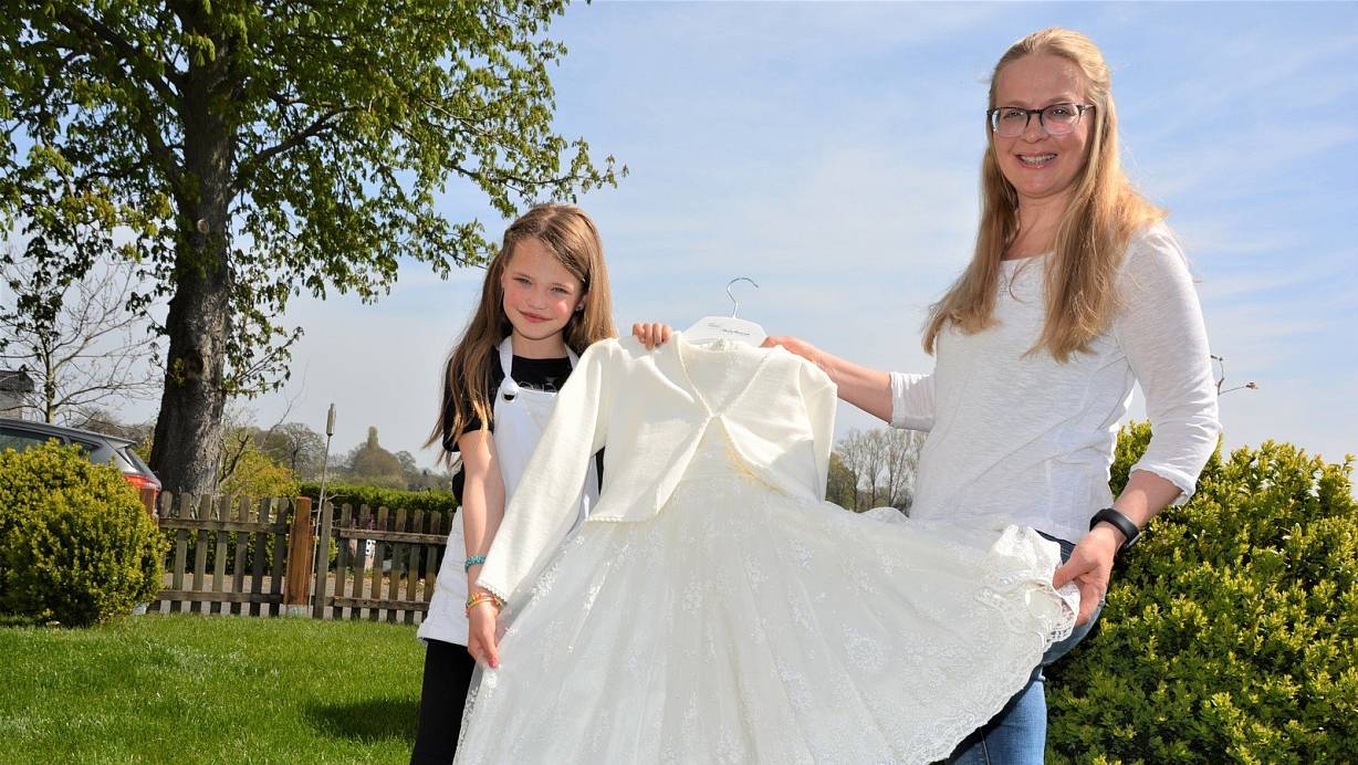 Die neunjährige Emma und ihre Mutter Yvonne Pape zeigen das festliche Kleid, das die Grundschülerin am Weißen Sonntag tragen wollte.  | © Karin Prignitz