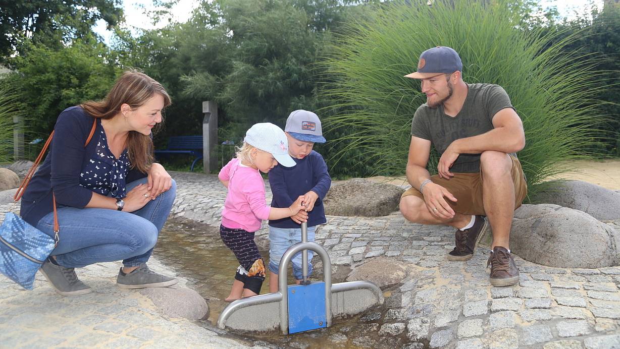 Die Familie Piecuch aus Hövelhof nutzt die Gelegenheit, etwas in Wohnortnähe zu unternehmen. Der kleine Cassian stapft munter durch das kühle Nass. Der Teich stellt die Mündungsbucht Dollart in Emden dar. Der flache Bereich wird durch den neuen Metallzaun von der tiefen Zone abgegrenzt. „Oh, da ist ein Blubb", ruft der Zweijährige aufgeregt.