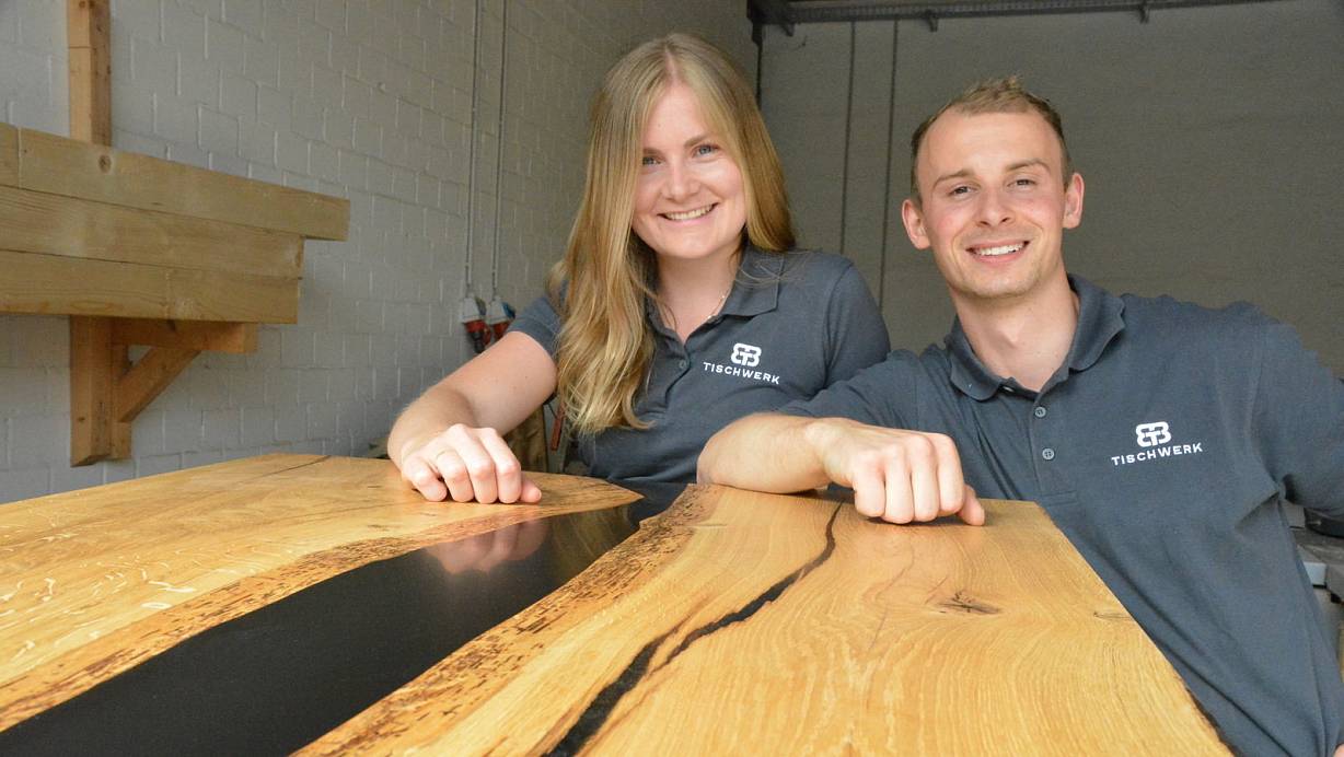 Das junge Start-up-Unternehmen von Dominik Becker und seine Freundin Tabea Düpree mit Namen BB-Tischwerk stellt massive Echtholz-Tischplatten in Kombination mit Epoxidharz her. | © Karin Prignitz