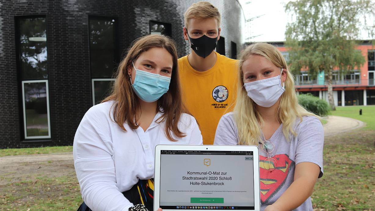 Jennifer Kleinemas (v.l.), Frederick Engelns-Runte, und Franka Fockel vom Jugendparlament präsentieren die selbst erstellte Onlineplattform „Kommunal-O-Mat“. | © Sigurd Gringel