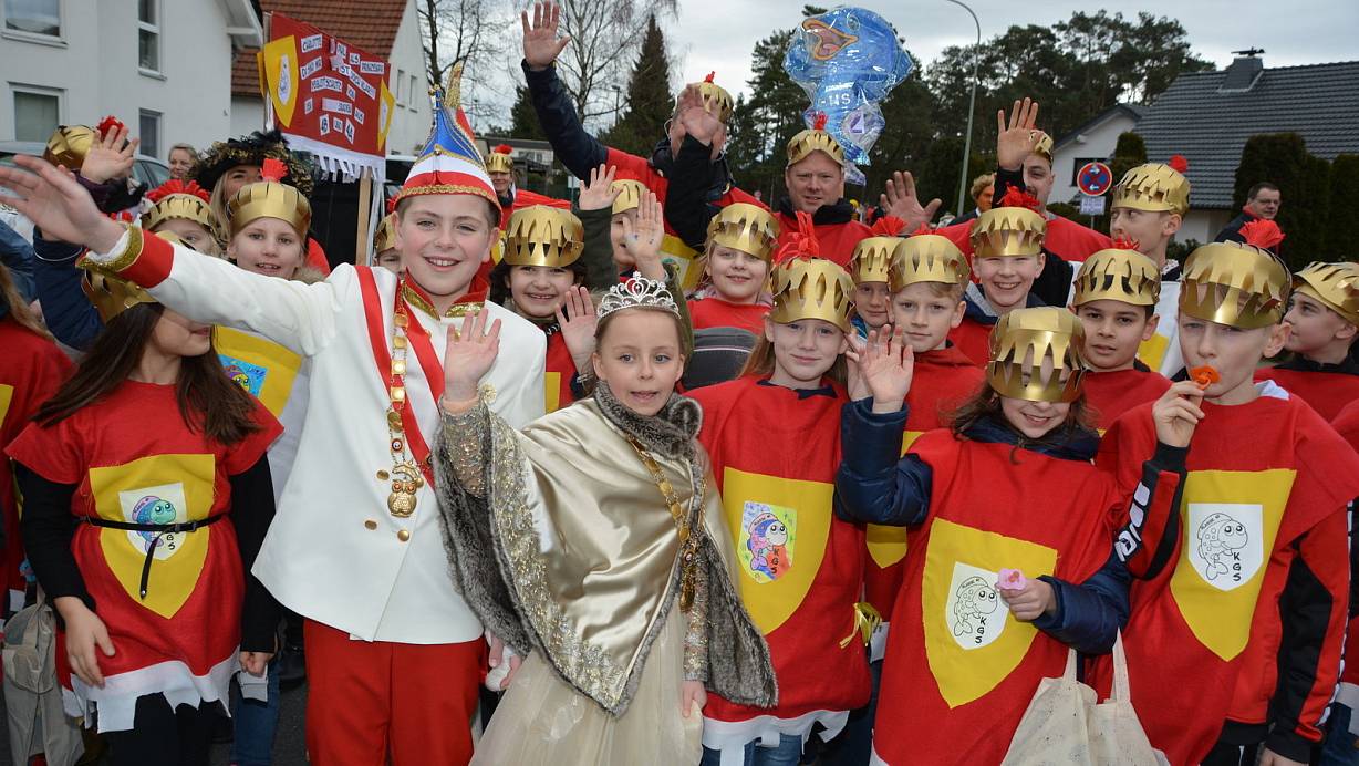 Das Kinderprinzenpaar Phil Hegemann und Charlotte Barth winkt beim Kinderkarnevalsumzug vom Februar inmitten einer Ritterschar den vielen Besuchern zu. | © Karin Prignitz