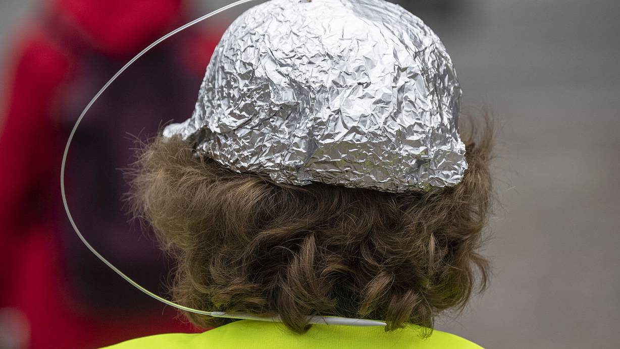 Einen bei Verschwörungstheoretikern beliebten und oft ironisierten "Aluhut" trägt eine Teilnehmerin an einer Kundgebung in Frankfurt. | © Symbolbild Picture Alliance