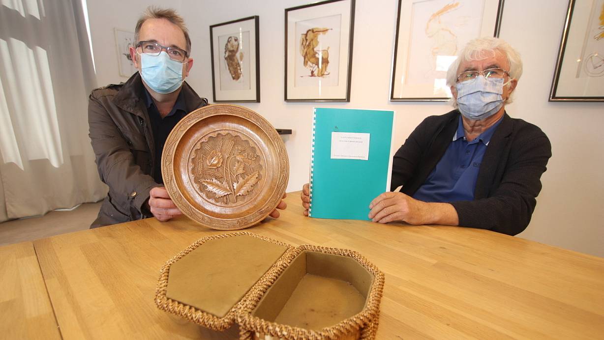 Heimatforscher übergibt einen Teller und ein Russenkästchen. Wichtig kann auch die Biografie des ehemaligen Lagerinsassen Dimitrij Orlov sein.