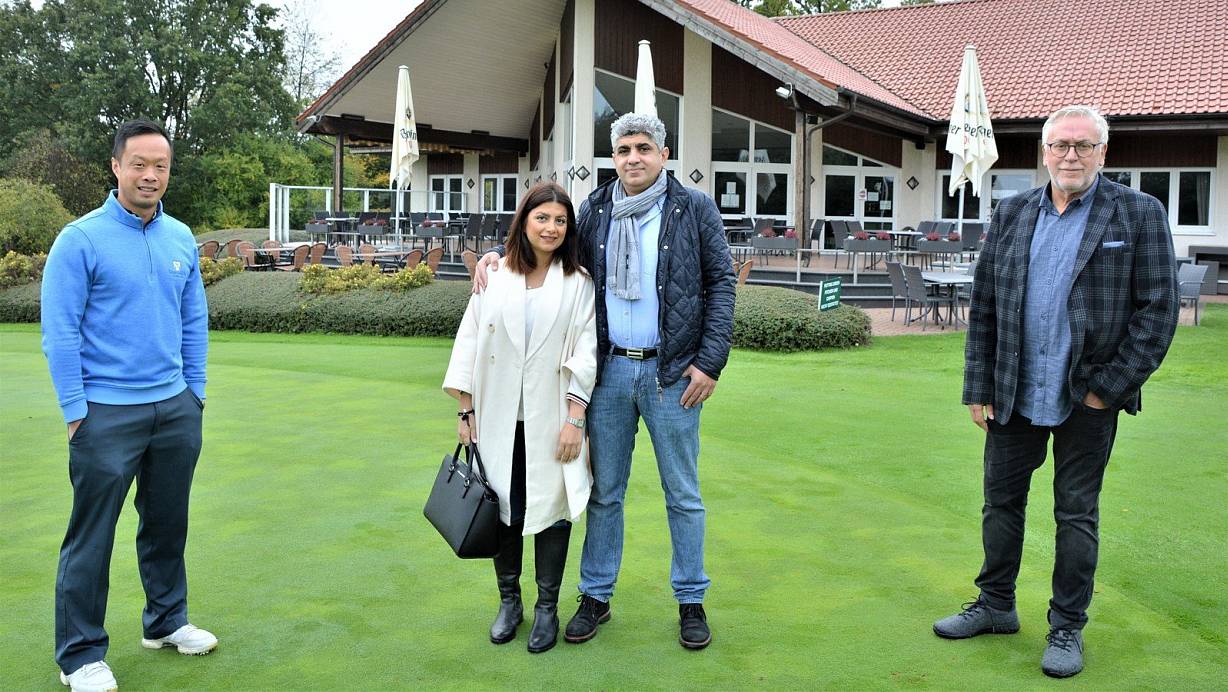 Chuk Yiu, Manager der Golf KG (l.), und Ralf Eigenrauch, Handlungsbevollmächtigter der Senne Golf Gut Welschof Betriebs GmbH & Co. KG (r.) freuen sich, mit Ali-Reza Brojerdi (hier mit seiner Frau Shadi) einen neuen Betreiber für das Restaurant „Gut Welschof“ gefunden zu haben. | © Karin Prignitz