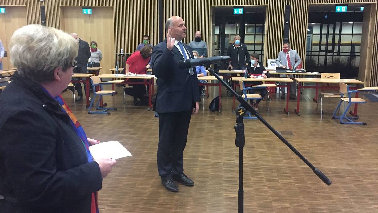 Das älteste Ratsmitglied ist Annegret Jürgenliemke (69). Sie hat die Ehre, den hauptamtlichen Bürgermeister Hubert Erichlandwehr zu vereidigen. Er liest den Text von einer Leinwand ab. | © sk