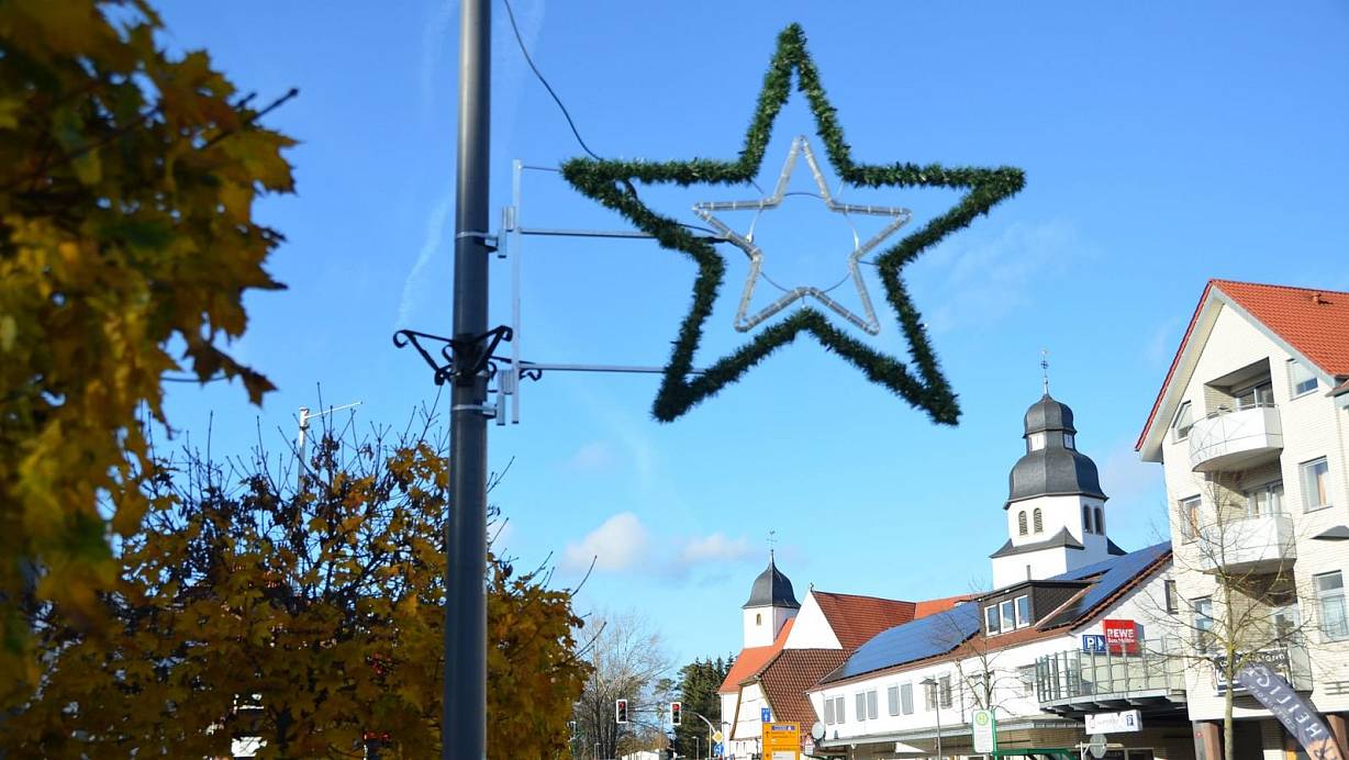 Weihnachtsbeleuchtung mit grünem Rand: Am Mittwoch wurden in Stukenbrock die ersten neuen Sterne angebracht. | © Stadt SHS