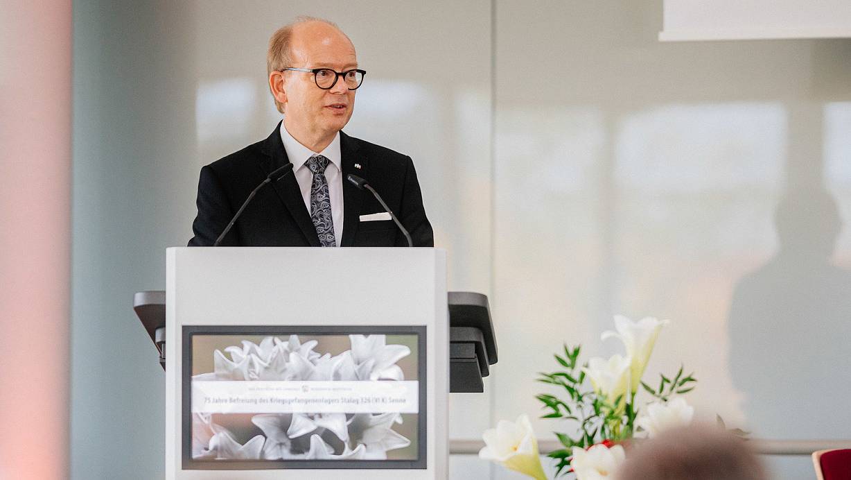 Landtagspräsident André Kuper beim Gedenken an 75 Jahre Befreiung des Kriegsgefangenenlager Stalag 326 im Oktober. | © Besim Mazhiqi