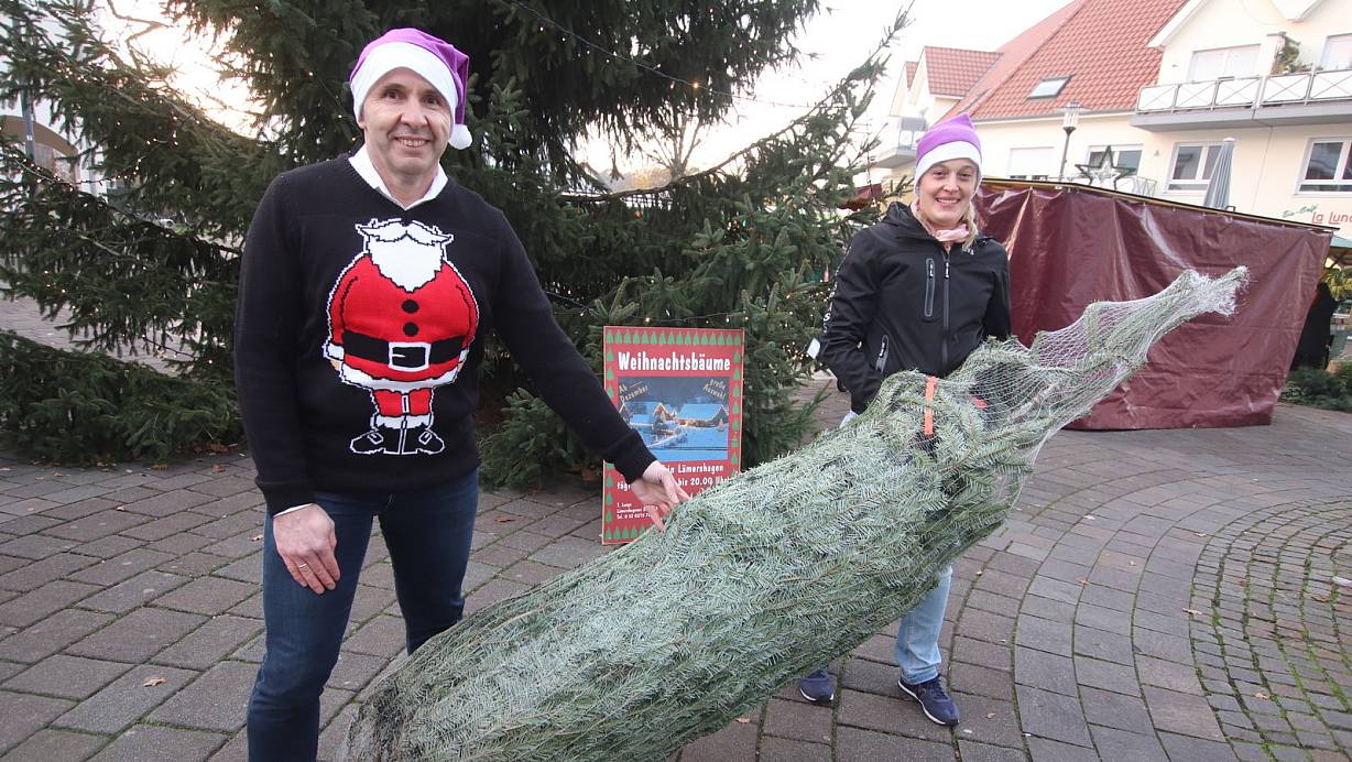 Jörg Tews und Eva Hassenewert mit dem vom Arends Hof Lämerhagen gespendeten Weihnachtsbaum. | © Sabine Kubendorff