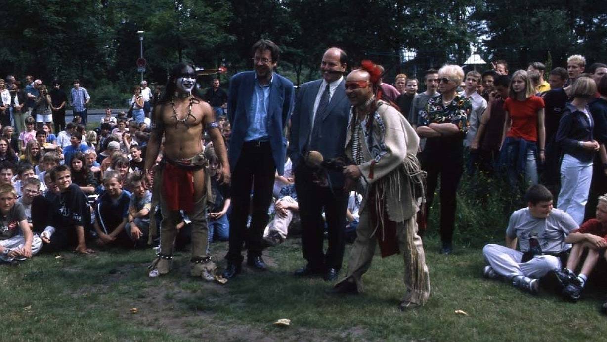 Regentanz für Sonnenschein: Die hauptberuflichen Indianer des Safariparks ergötzen nicht nur Hunderte von Realschülern, sondern auch Bürgermeister Hubert Erichlandwehr und Wettergott Jörg Kachelmann. | © Sabine Kubendorff