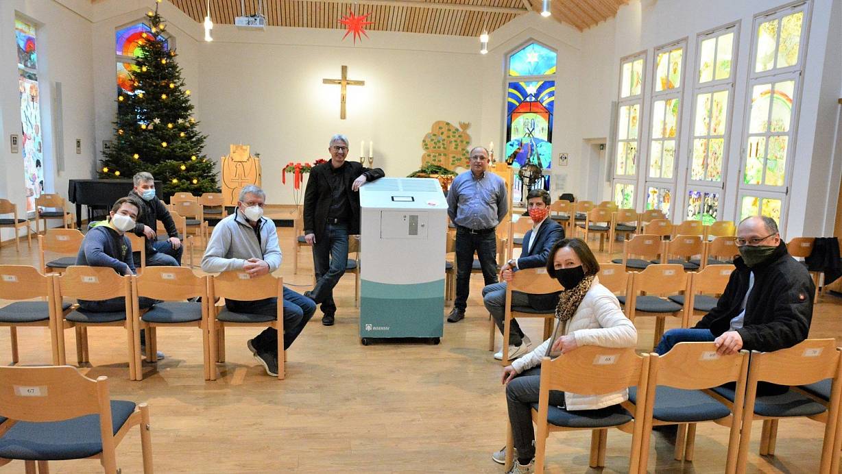 Ehrenamtler Kevin Schmid, die Küster Viktor Schauer und Ralf Schnelle, die Pfarrer Carsten Glatt und Reinhard Bogdan sowie Eike Linnenbrügger von der Firma Insensiv und die Presbyter Richarda Robrecht und Holger Stritzke (v. l.) mit dem Hochleistungs-Lüftungsgerät in der Friedenskirche. | © Karin Prignitz