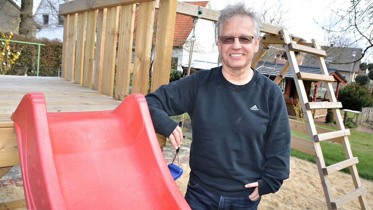 Werner Scheips (60) im heimischen Garten. Dort können seine Kinder neben einer Rutsche andere Spielgeräte nutzen. | © Karin Prignitz