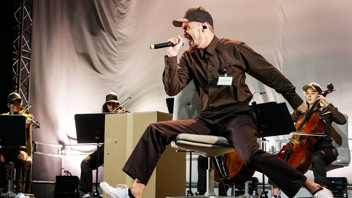 Lukas Strobel beweist als "Alligatoah", dass auch auf einem Stuhl zu Streichermusik so richtig gefeiert und getanzt werden kann. Foto: Kristoffer Fillies | © Kristoffer Fillies