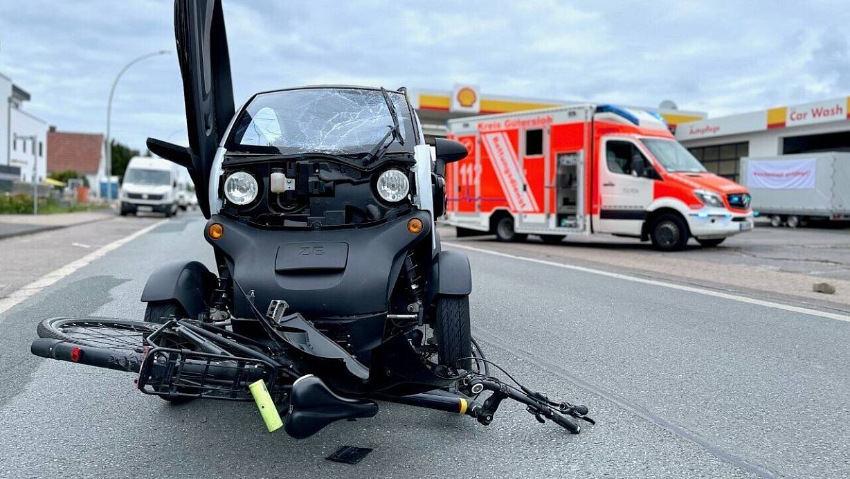Bei diesem Unfall auf der Kaunitzer Straße hat sich der Radfahrer zum Glück nur leicht verletzt. Bei dem Wagen handelt es sich um einen zweisitzigen Renault Twizy. | © Besim