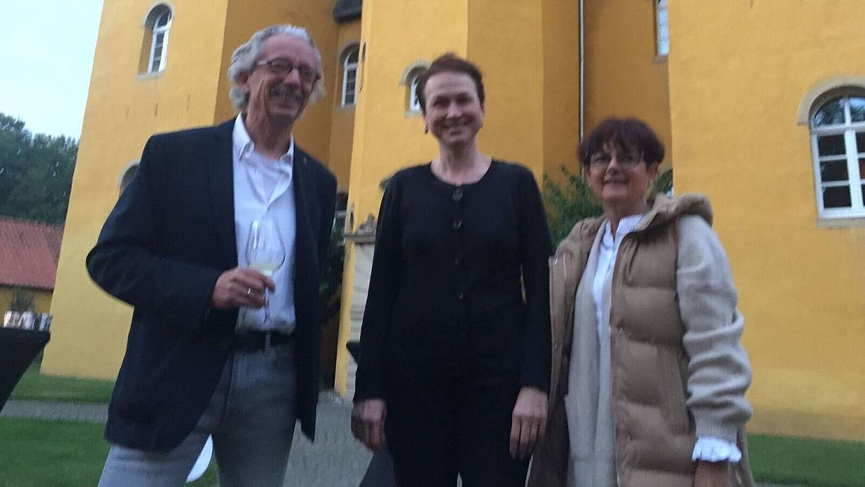 Die Konzertorganisatoren Wolfgang und Doris Feuerborn (r.) mit der Organistin Natalia Sander im Schlosshof. | © Sabine Kubendorff