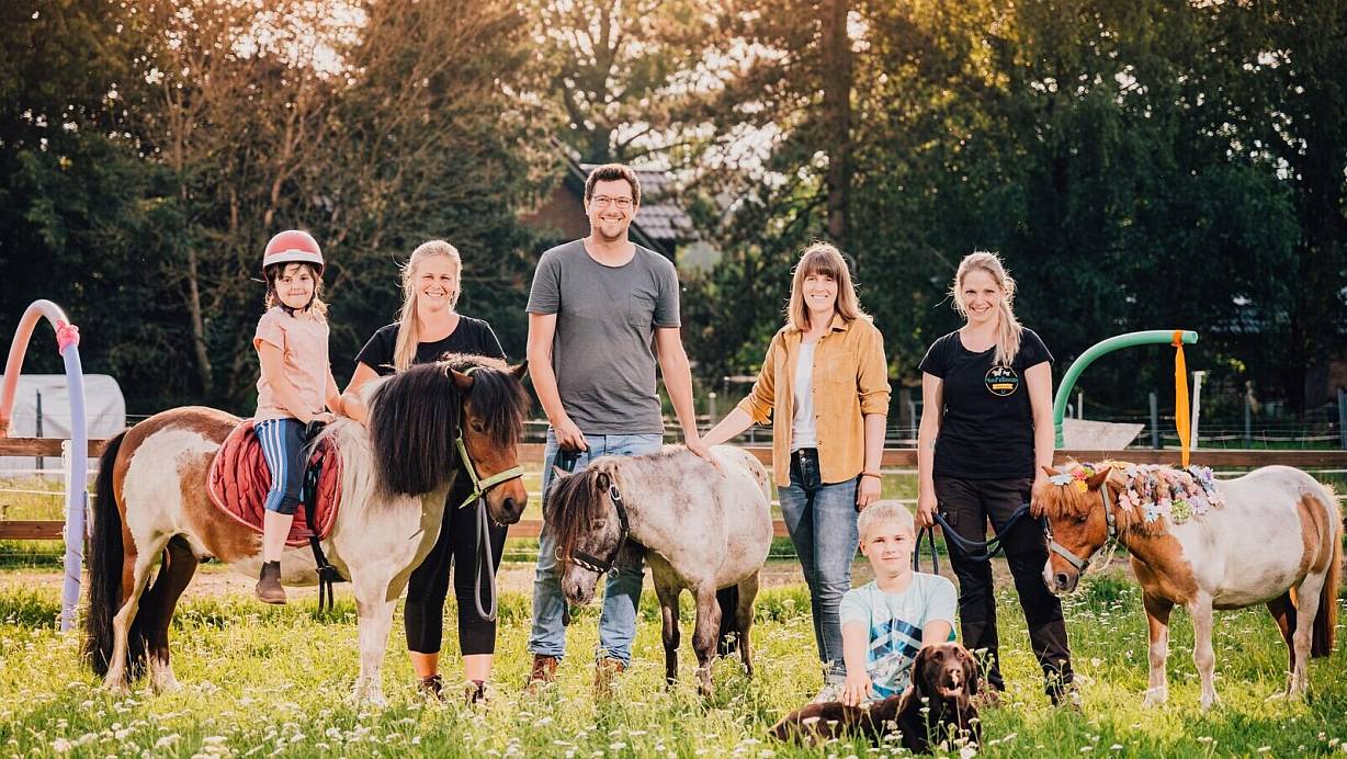 Bringen Kindern den Umgang mit Ponys bei: Gemeinsam mit Tochter Emilia (7) und Sohn Giuliano (8) suchen Lena Kipshagen (v. r.), Nadine Krietenbrink, Christopher Klodt und Sandra Krietenbrink derzeit nach einer geeigneten Fläche in und um Schloß Holte-Stukenbrock, um das Angebot der „MiniFellnasen“ zu erweitern. | © Besim Mazhiqi