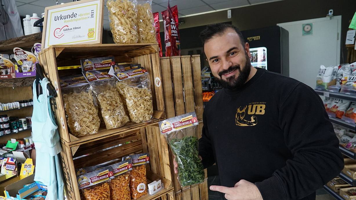 Die Proteinnudeln von Gökhan Yilmaz gibt es jetzt auch in den Geschmacksrichtungen Tomate und Spinat zu kaufen. Von einem Handelspartner wurde der Inhaber von "Ultimate Body" zum Händler des Jahres 2021 ausgezeichnet. | © Christian Geisler