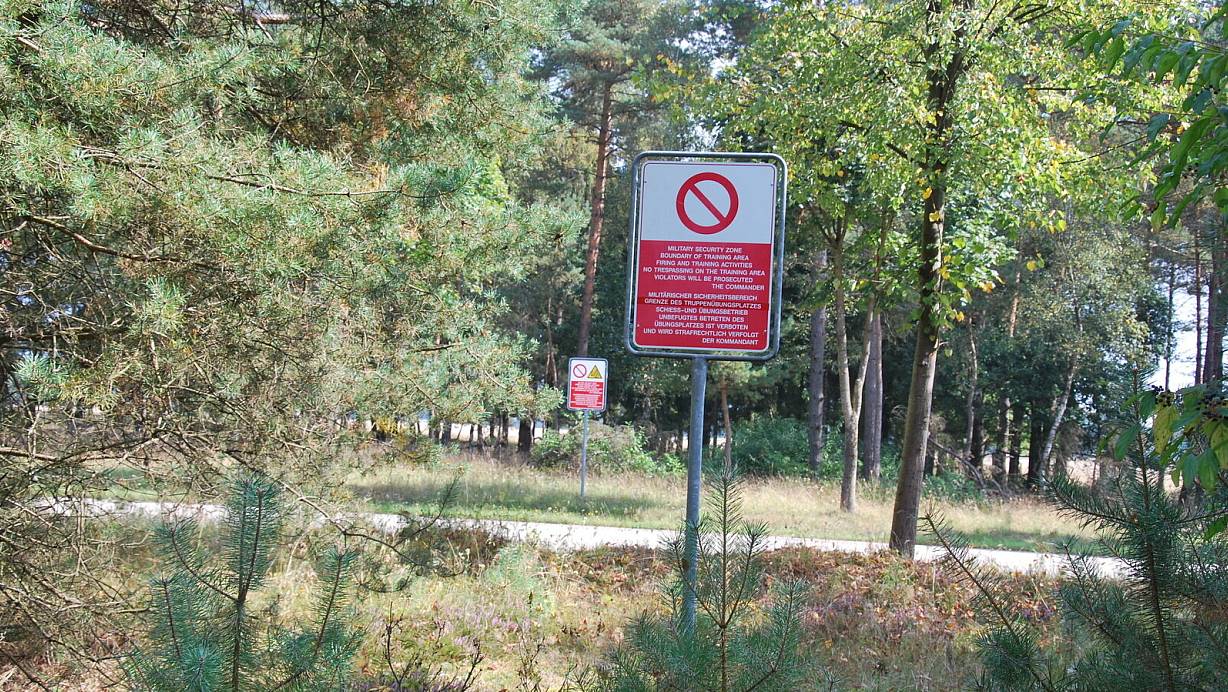 An der Panzerringstraße in der Moosheide weisen Schilder auf das militärische Sperrgebiet hin. | © Sigurd Gringel