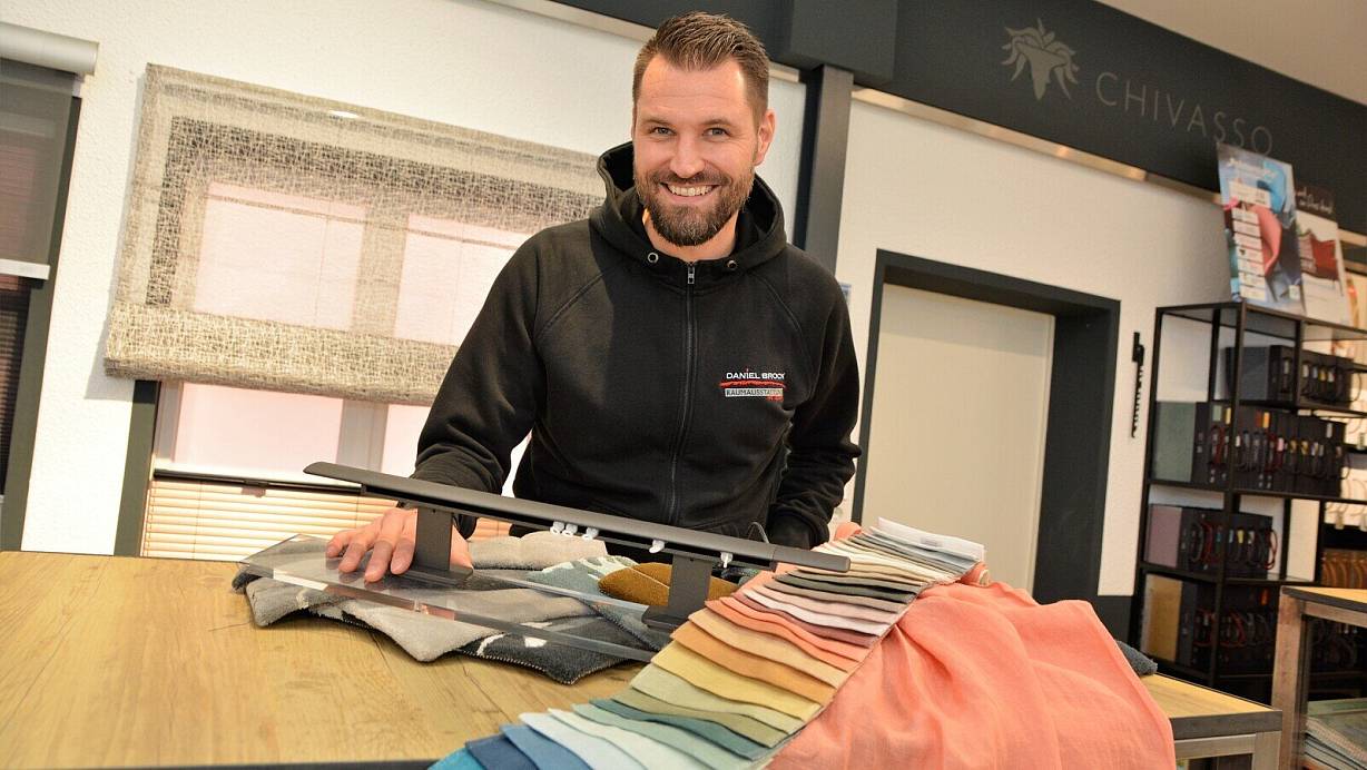 Daniel Brock (40) beherrscht die gesamte Palette der Raumausstattung von Gardinen über Bodenbeläge bis hin zu Markisen, von denen er Muster in den Ausstellungsräumen zeigen kann. | © Karin Prignitz