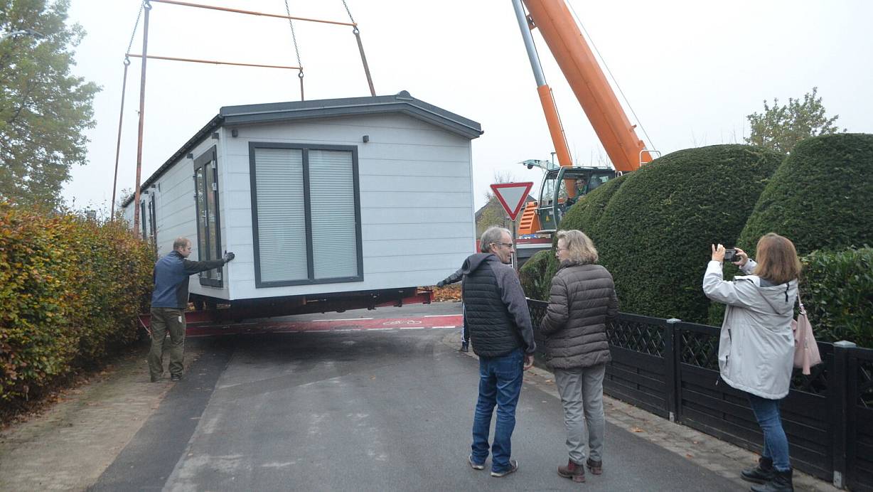 Ein Haus schwebt ein. Monika und Alfred Dierks haben sich bei E-Bay ihr neues Wohnhaus gekauft – ein Mobilheim, das mit dem Kran angeliefert werden muss. | © Sibylle Kemna
