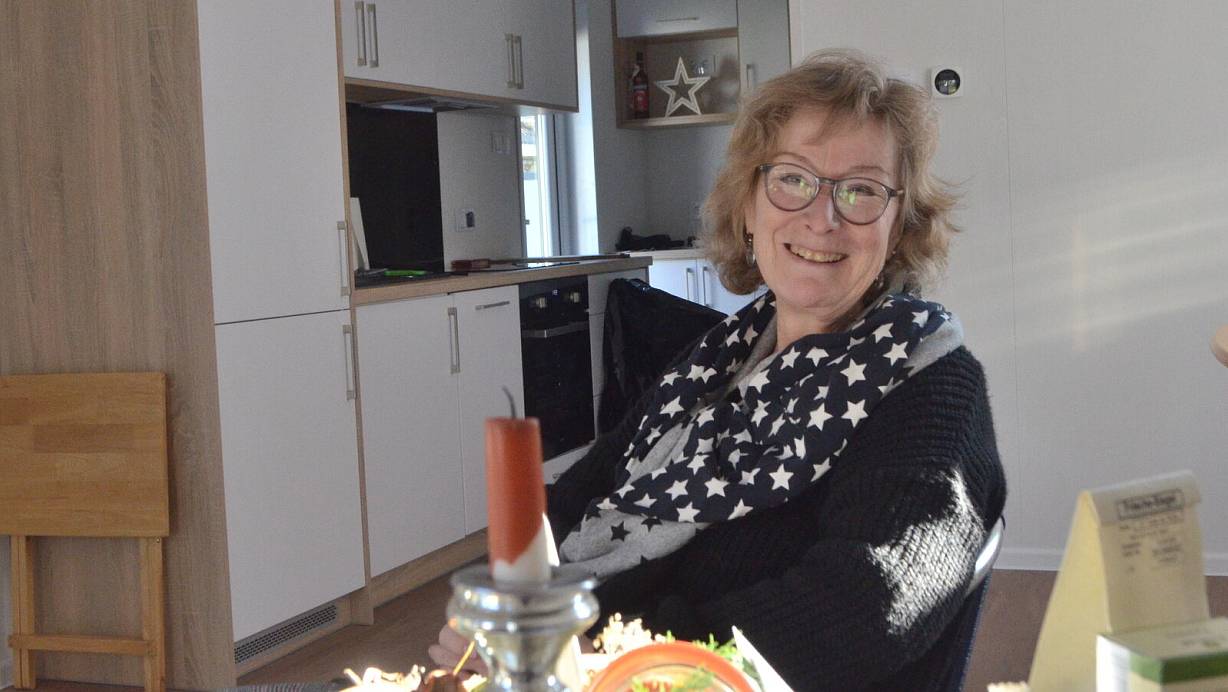 Monika Dierks (65) sitzt im noch kargen Wohnzimmer. Bisher steht dort nur ein Tisch mit zwei Stühlen. Die Küche im Hintergrund ist schon einsatzbereit. Der Kühlschrank kühlt, und frischer Kaffee wird aufgebrüht. | © Sibylle Kemna
