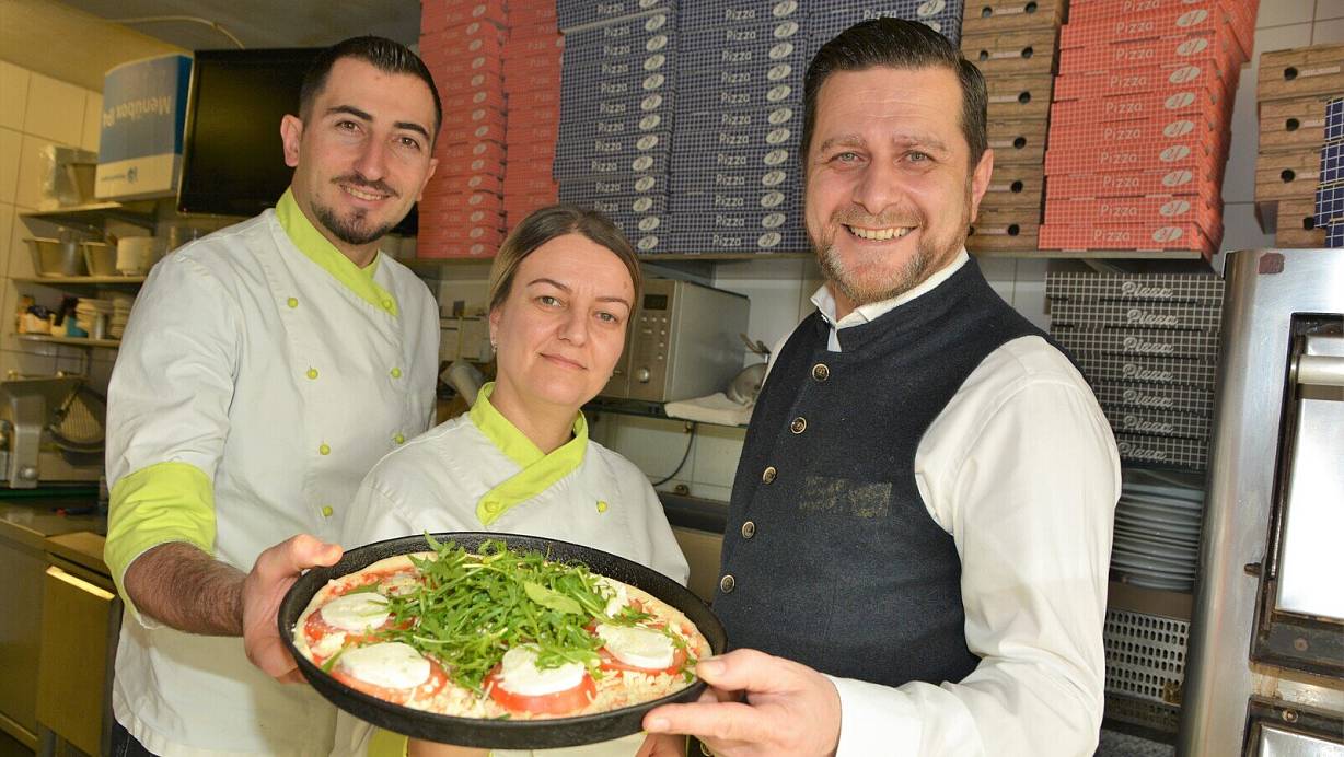 Servet Hajrullahi (r.) und Küchenchef Bledar Bualli freuen sich, dass Lindita Arifi die Kunst des Pizzabackens beherrscht. | © Karin Prignitz