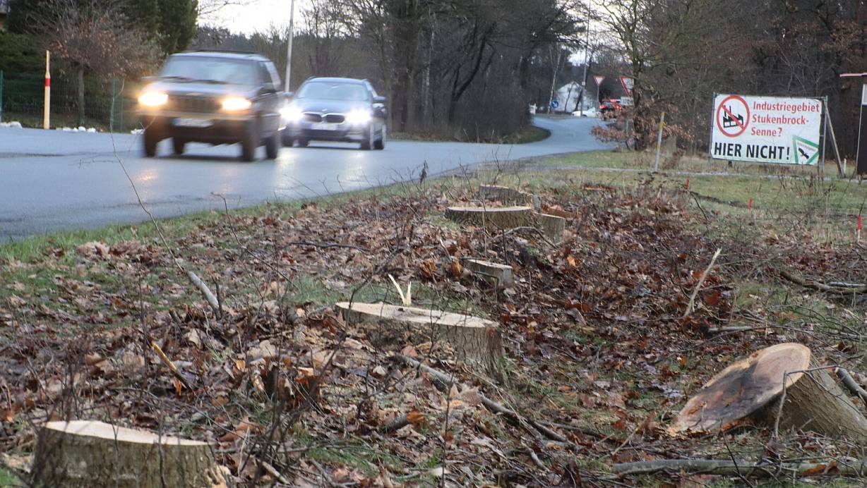 Der sichtbare Protest gegen das geplante Industrie- und Gewerbegebiet in Stukenbrock-Senne auf dem Schild erzielt nicht die erhoffte Wirkung. Auch wenn der Bebauungsplan noch nicht beschlossen ist, werden die Bäume am Lippstädter Weg schon gefällt. | © Sigurd Gringel