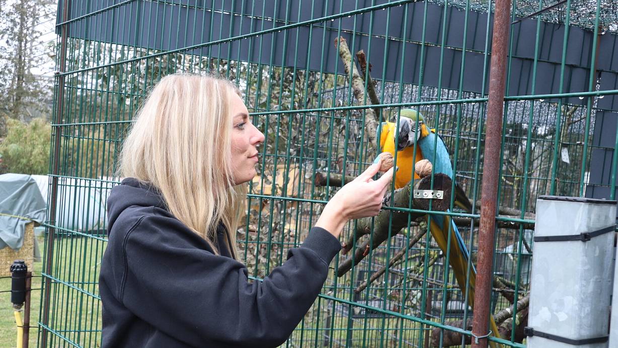 Verena Tanger aus Schloß Holte-Stukenbrock im Kreis Gütersloh lockt ihren Gelbbrust-Ara "Henriette" ans Gitter. | © Sigurd Gringel