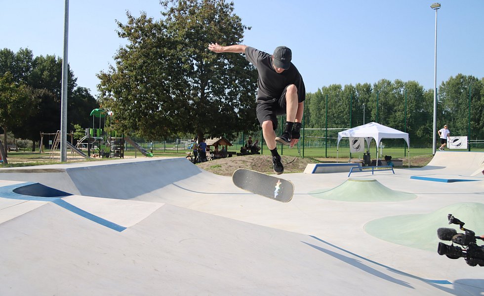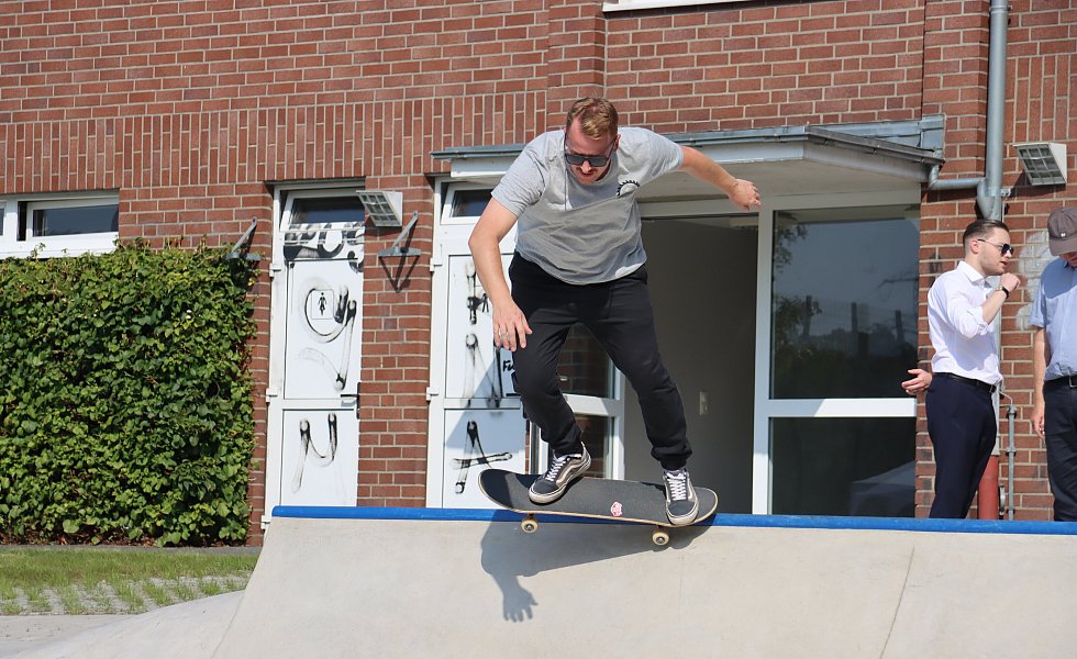 Erichlandwehr erinnerte daran, dass es zuvor lediglich eine wenig herausfordernde Halfpipe gegeben habe. Eine Eröffnungsfahrt lehnte der Bürgermeister dankend ab: „Ich habe noch nie auf einem Skateboard gestanden.“ Das überließ er gern den Profis, die den Eröffnungsgästen aus Verwaltung und Politik zeigten, wie man auf einem Board in der Luft schweben kann. Nils Dessloch bedankte sich für den Bau der Bahn mit einer Skate-Skulptur, die er selbst mit einem 3D-Drucker hergestellt hatte. Die soll einen geeigneten Platz im Sportamt finden.