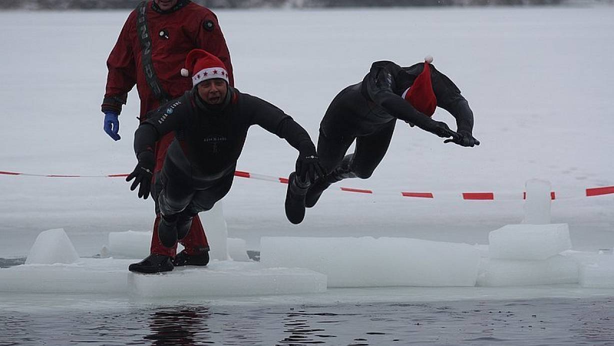 Die DLRG-Schwimmer Rainer Fleer (l.) und Michael Dressler hechten in das von den dicken, im Hintergrund liegenden Eisschollen befreite Loch. Die Mützen bleiben übrigens trotz des Sprunges auf den Köpfen. | © FOTO: SVEN TIEKÖTTER