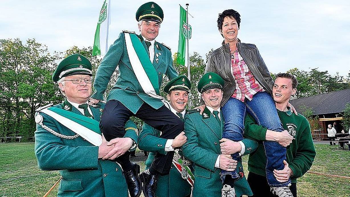 Die begehrten Insignien fallen früher und schnell nacheinander. "Das ist nur ein Gucken", sagt Schriftführer Hermann Rodenbeck erfreut und notiert sich die Namen der erfolgreichen Schützen. Nach 53 Schüssen fällt das Zepter, das sich Markus Overkemping in die Brusttasche seines Grünrocks steckt. Gemeinsam mit Katharina Streck bilden beide das Zepterprinzenpaar. Zu ihnen auf den Thron gesellt sich das Kronprinzenpaar Sven und Gabi Teßmann. Thomas Gerkens und Janine Cyperski sind das Apfelprinzenpaar.