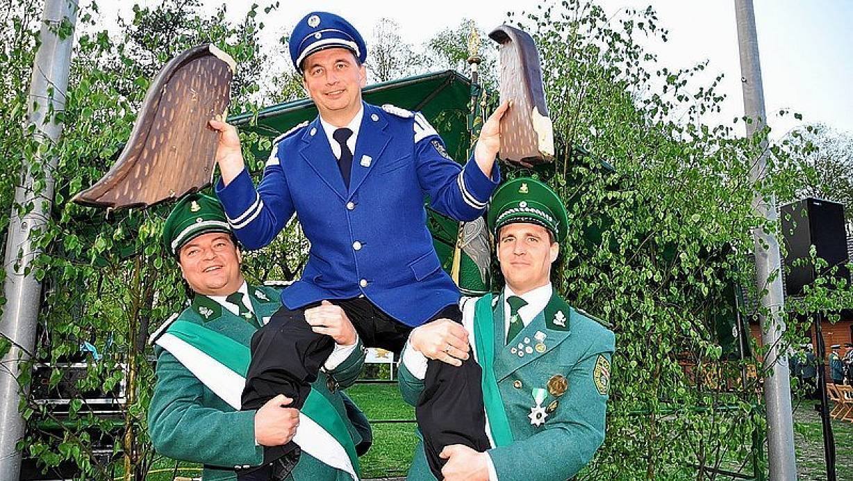 Böllerschüsse verkündeten am Abend des 1. Mai, dass Rolf Schniedermann den schon reichlich ramponierten hölzernen Vogel mit einem gezielten Schuss zu Boden hatte purzeln lassen. Auf den Schultern zweier Grünröcke ließen Schützen und Gäste den neuen König hochleben. Ebenso viele Hände schüttelten Königin Manuela Brock-Schniedermann und Prinzessin Helen, die bald sechs Jahre alt wird, jetzt aber erstmal mit ihrem Papa feierte.