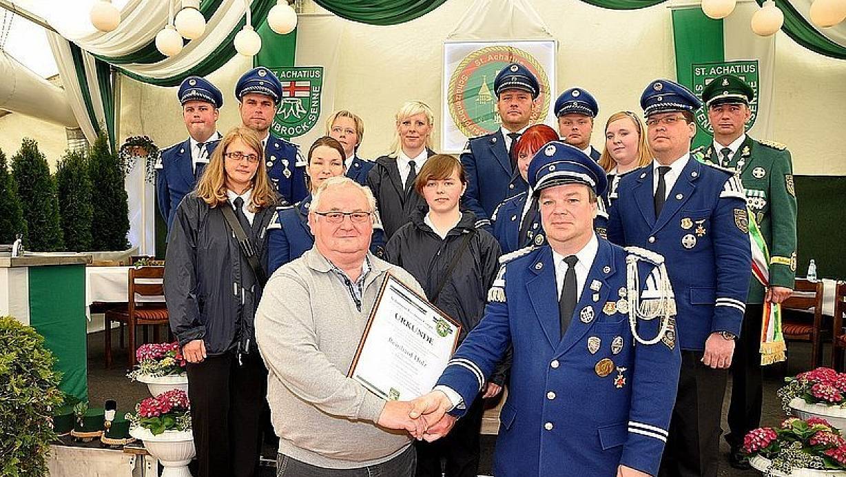 Beim Schützenfrühstück im neuen Festzelt gab es aber auch Erfreulicheres zu beklatschen. Insbesondere bei den anstehenden Ehrungen, die Heiner Knocke vornehmen konnte. Neben einem sichtlich überraschten Schriftführer Hermann Rodenbeck, der das St.-Sebastianus-Ehrenkreuz verliehen bekam (siehe "Mein Stück vom Glück"), bat der Bezirksbundesmeister Franz Josef Biermeier, Karl-Heinz Kleinemeier und Wilfried Erichsmeier auf die Bühne. Alle drei wurden in Anerkennung ihrer großen Verdienste mit dem Hohen Bruderschaftsorden ausgezeichnet.