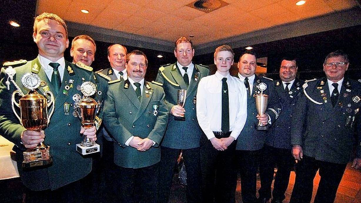 Eingeladen, ihr Können am Luftgewehr (aufgesetzt) unter Beweis zu stellen, waren die Schützen, die sonst nicht der aktiven Schießabteilung angehören. Und einer räumte fast alle Pokale ab: der erste Brudermeister Burkhard Deppe. Dieser setzte sich mit 28 Ring im Stechen gegen Erwin Hunke durch und nahm den Pokal, gestiftet von den ehemaligen Königen der Bruderschaft, entgegen. Auch bei der Verkündung des Gewinners des Jungschützenprinzenpokals sagte Schießmeister Franz-Josef Biermeier einleitend den Satz: "Den habe ich mal als König trainiert." Und jeder wusste, es war wieder Burkhard Deppe gemeint, der auch hier mit 28 Ring den Pokal erkämpfte.