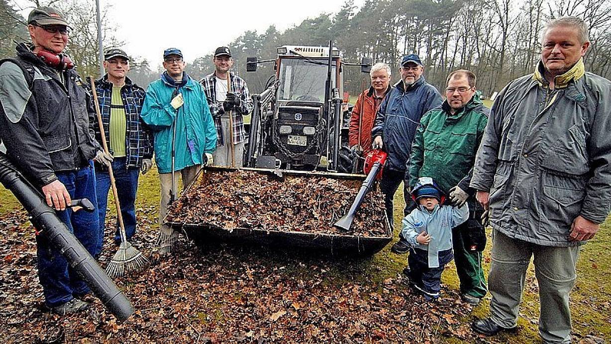 Schloß Holte-Stukenbrock (lina). "Jetzt wirds höchste Zeit, dass hier alles in Ordnung kommt", sagt Hermann Rodenbeck von den St.-Achatiusschützen. Auf dem Schützenplatz in Stukenbrock-Senne herrscht rege Geschäftigkeit. An einer Seite wird der alte Holzzaun ausgebessert, an der anderen werden die dichten Büsche beschnitten. Außerdem wird das alte, vermoderte Laub aus dem letzten Herbst zusammengeharkt. "Am 1. Mai haben wir hier schon unser Vogelschießen und zehn Tage später, am 11. Mai, startet hier unser Schützenfest", sagt Rodenbeck. "Da muss alles tipptopp sein." Auch die Kleinsten helfen schon kräftig mit beim Frühjahrsputz rund um die Schützenhalle, der traditionsgemäß einmal pro Jahr stattfindet. "Nils ist zwei Jahre alt und hat schon richtig mit angepackt", sagt der stolze Papa, Robert Janus.