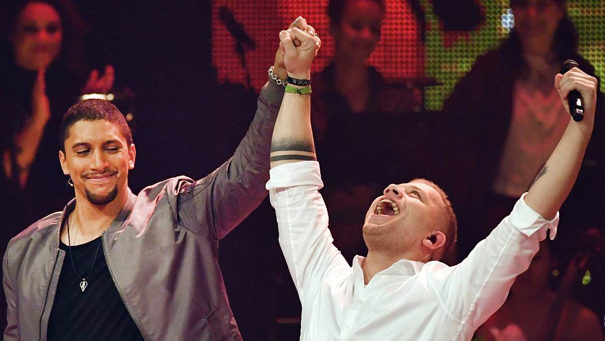 Sänger Andreas Bourani (l.) und das Talent Tay Schmedtmann aus seinem Team freuen sich bei der Halbfinal-Show über den Einzug ins Finale. | © dpa