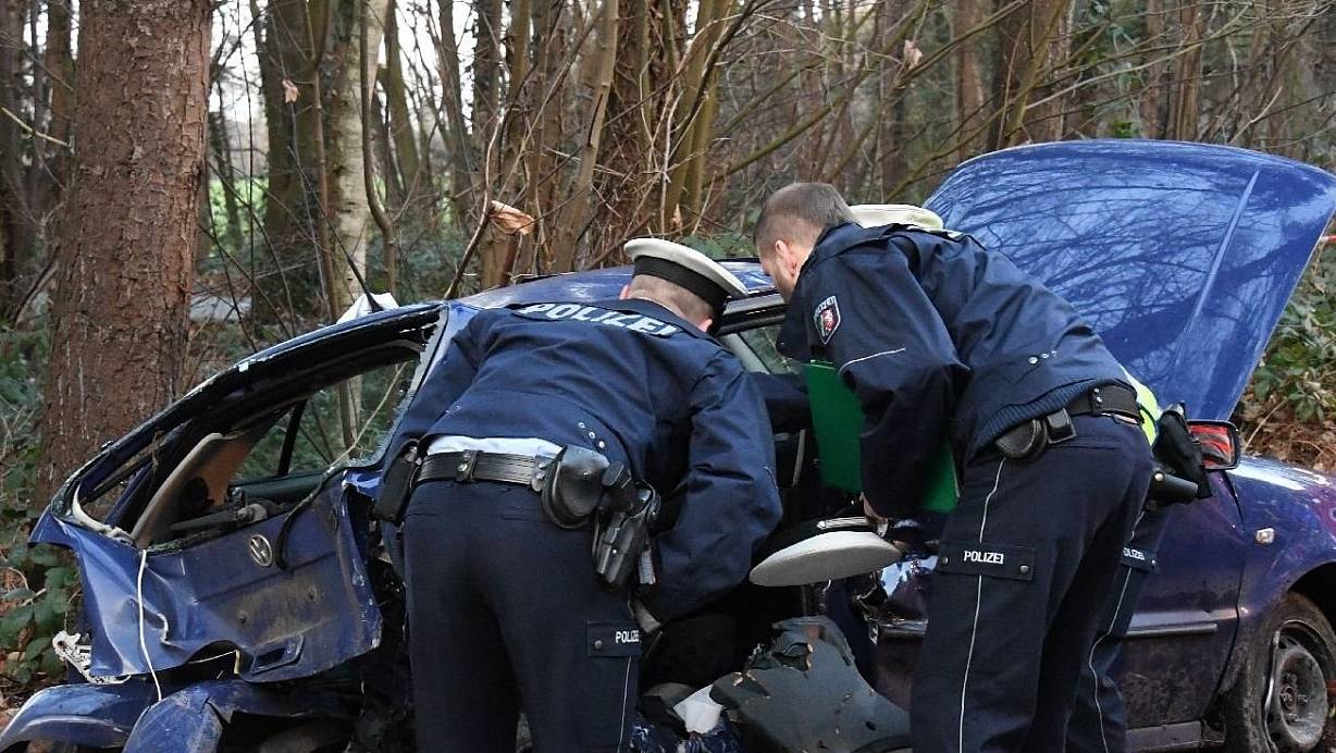 Zwei Polizisten am Wrack nach dem tödlichen Unfall in Steinhagen. | © Andreas Eickhoff