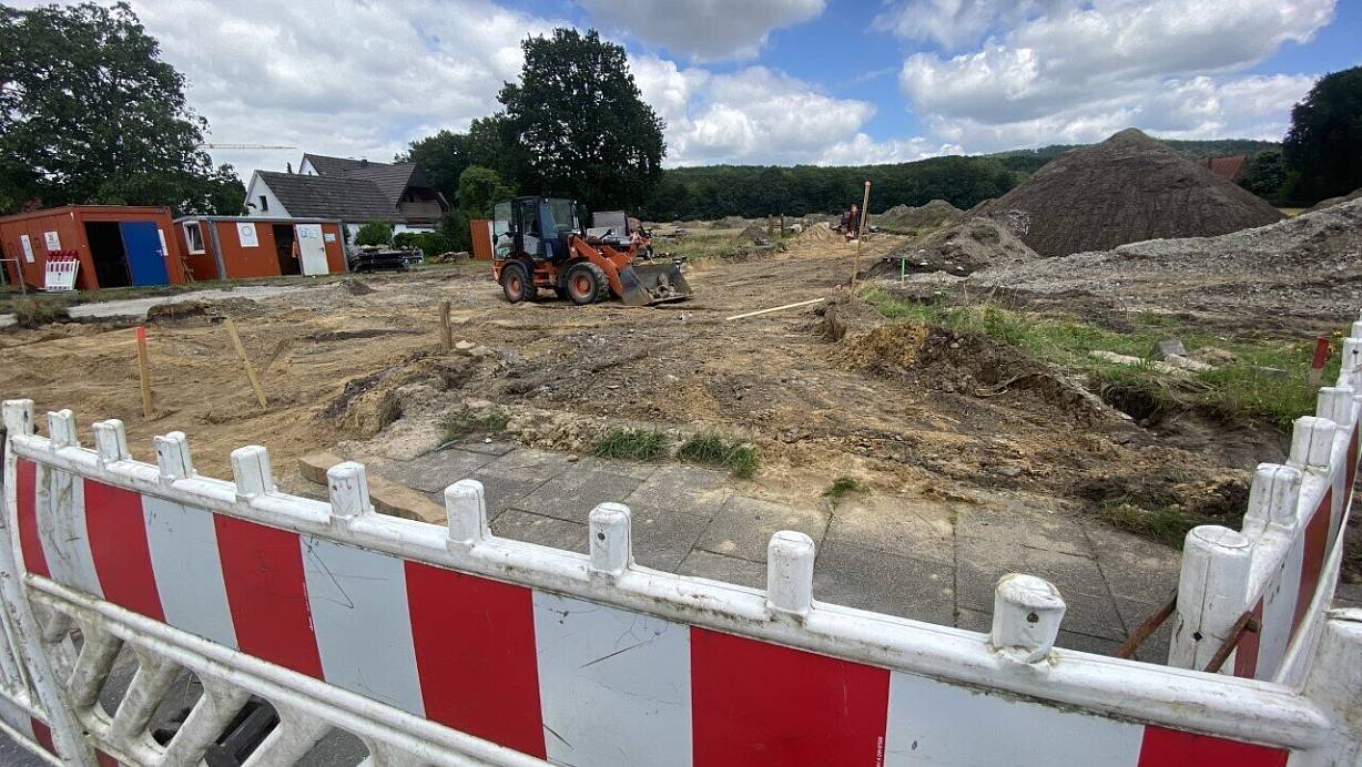 Während südlich der Amshausener Straße die ersten fertigen Häuser stehen, haben vor wenigen Tagen die Erschließungsarbeiten für das Neubaugebiet nördlich der Amshausener Straße begonnen. | © Frank Jasper