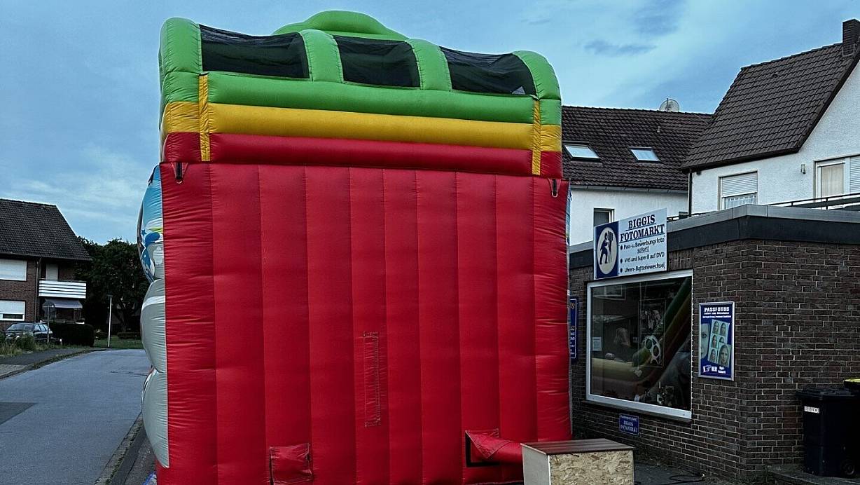Die Hüpfburg auf dem Parkplatz. Unter dem Holzkasten befindet sich der Generator - und der ist Anwohnern zu laut. | © NW