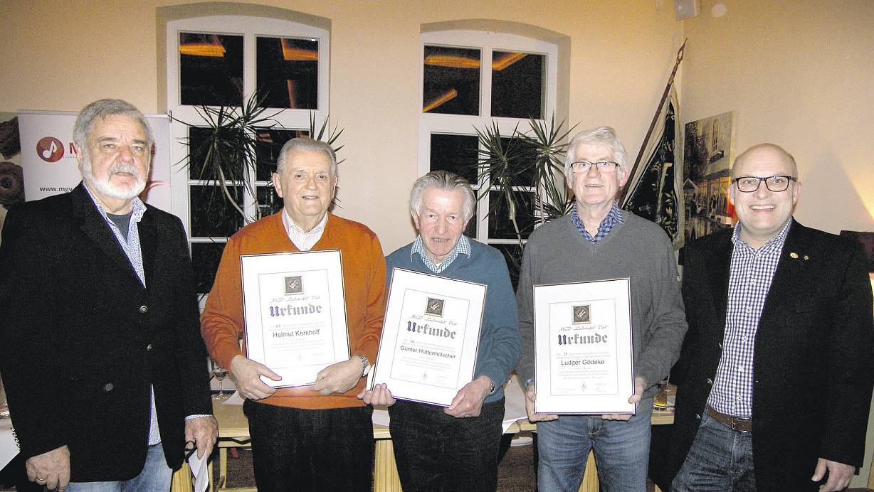 Zum Abschluss wurden langjährige Mitglieder geehrt. Eine Urkunde und Verler Gutscheine erhielten Helmut Kerkhoff für 65 Jahre, Günter Hüttenhölscher für 50 Jahre und Ludger Gödeke, der seit 25 Jahren im MGV singt.