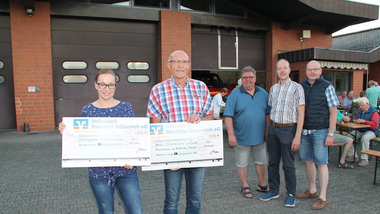 Verl (ale). Ein Zufall hatte die Kolpingfamilie und Mareike Neuhaus vom Verein "Sternenzauber & Frühchenwunder" zusammengeführt. Neuhaus und ihre Mitstreitern produzieren Bekleidung für tot- oder zu früh geborene Kinder. „Das ist eine wichtige Sache, die unsere Unterstützung verdient“, sagt Klaus Siggemann die Entscheidung der Kolpingfamilie. Aber auch Dieter Pickert, dessen Spendenaktion „Schulterband“ für das Familienhaus am Uniklinikum in Münster läuft, verdiene volle Unterstützung. Das Familien- und Schützenfestes der Kolpingsfamilie Verl hat es möglich gemacht, dass Neuhaus und Pickert jeweils eine Spende über 1.250 Euro erhielten. Überreicht wurden sie während er Halbjahresveranstaltung auf dem Gelände des Feuerwehrgerätehauses in Kaunitz. Zuvor waren etwa 50 Teilnehmer mit Verls Bürgermeister Michael Esken auf eine Baustellen-Radtour gegangen. Die rund 20 Kilometer lange Strecke führte vorbei an aktuellen städtischen Bauvorhaben, wie Rathaus, Kindergarten in Sürenheide und Ausbau an der Uhlandstraße. Die von Berthold Pape organisierte Fahrt nutzen die Teilnehmer, um sich über die fortschreitenden Arbeiten von Michael Esken informieren zu lassen. Traditionell fand im Anschluss das gemeinsame Grillen vor dem Gerätehaus statt.
