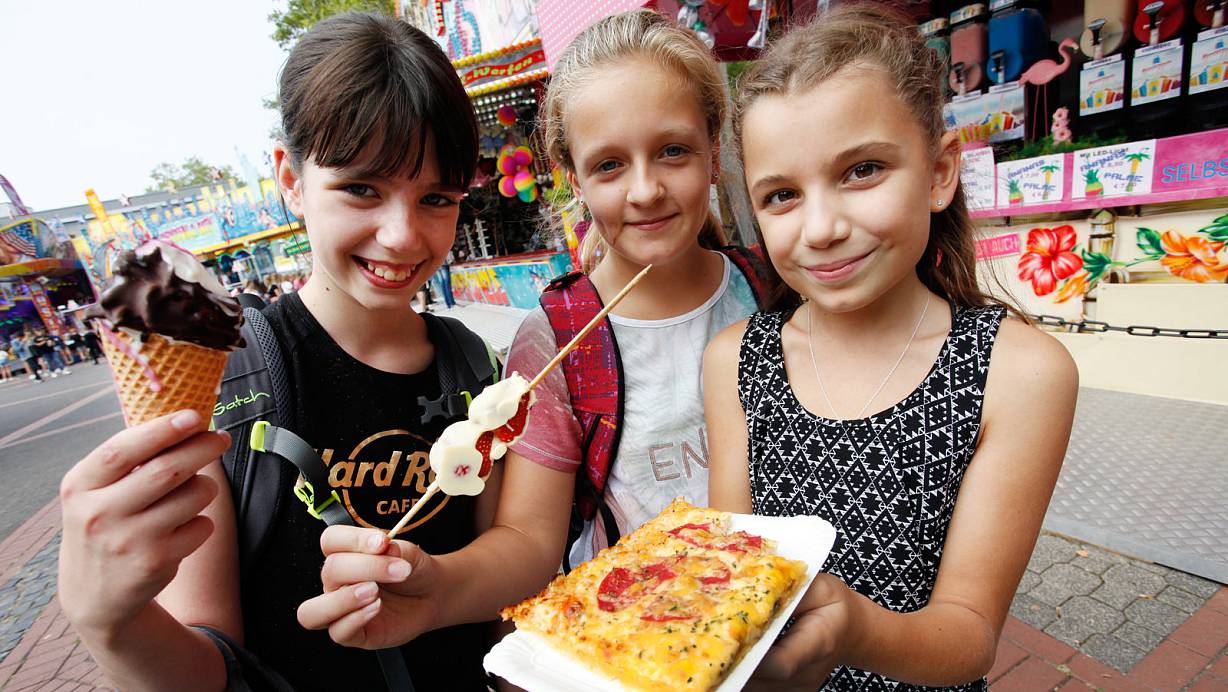 „Verler Leben" kann gut schmecken: Nike (v. l.), Finja und Alina beschlossen ihren Rundgang über die Kirmes mit Eis, schokolierten Früchten und Pizza. | © Roland Thöring