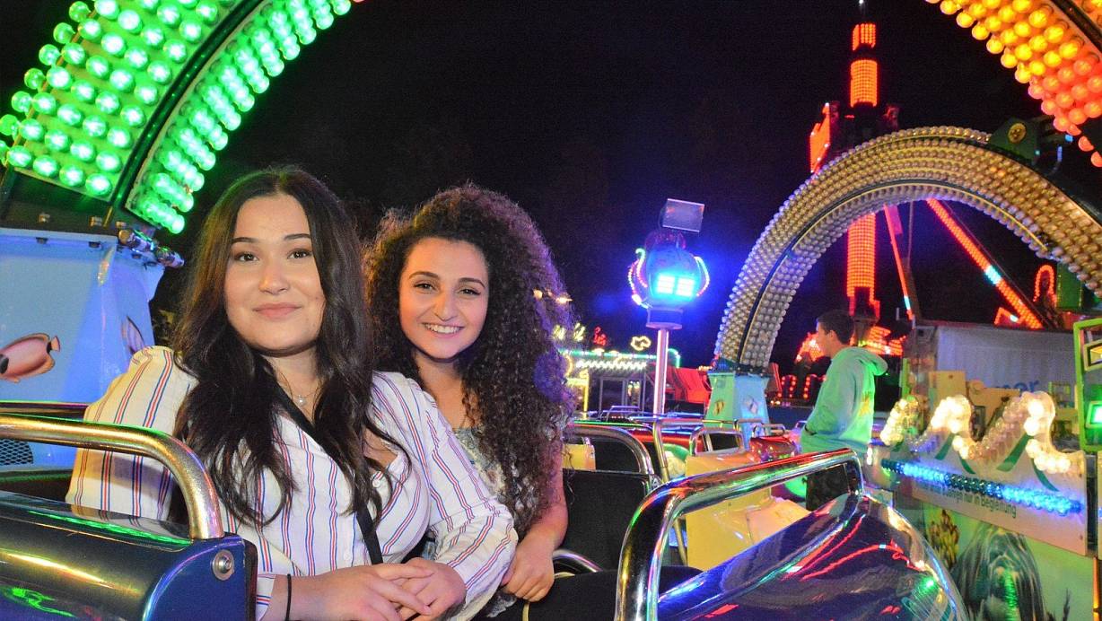 Startklar: Eda Yildiz und Rita Ghukasyan gehen in die Luft. Ihr Fluggerät wird sie gleich auf der Kirmes unterm bunten Lichterbogen in die Höhe befördern. | © Karin Prignitz